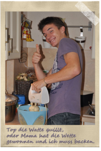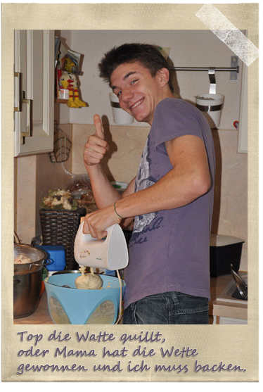 Josef hat gestern eine Wette verloren und somit musste er heute einen Kuchen backen. Aber was der geschafft hat, hab ich noch nie gesehen, ohne Mist. Der gesamte Teig klebte oben am Mixer und nich in der Schüssel. Wir haben echt herzlich gelacht.