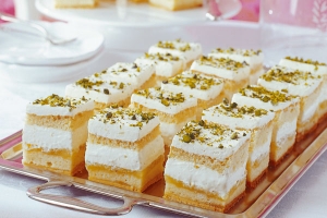Mürbeteig in die Springform geben, mit etwas Kompott bestreichen. Biskuit waagerecht teilen (hier als Tipp (Bäckersfamilientocher), rundum anschneiden und dann mit einem Faden durchtrennen. Was sich alleine schwer gestaltet ;), eine Hälfte auf den Mürbeteig mit dem Apfelkompott legen und das restliche Apfelkompott darauf verteilen. Zwei Drittel der Creme darauf verteilen und glatt streichen. Übrigen Biskuit drauflegen und mit restlicher Creme bestreichen. Mit Pistazien bestreuen.