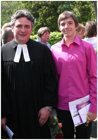 Wenigstens gelang uns ein Bild mit seinem Pfarrer, dem ich überaus dankbar bin das er meinen Sohn so sieht wie er ist, und der nicht nur Pfarrer sondern auch Mensch ist. Und es tut mir wahnsinnig leid das er in unserer Gemeinde aufhört und nun die beiden anderen einen anderen Pfarrer haben werden. Denn ich glaube nicht jeder Pfarrer ist so zugänglich für die Bedürfnisse und Sorgen junger Menschen wie Peter. Als wir dann nach Hause gingen wurde zuerst einmal Kaffee getrunken und der leckere Kuchen verspeist, obwohl wir noch Massen über haben, ich glaube ich habe wohl mit zuvielen Gästen gerechnet. Aber dann essen wir eben die ganze Woche daran ;)!