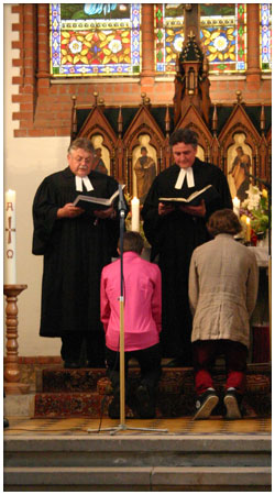 Ich denke den hat er wohl sehr treffend ausgesucht und die zwei Jungs vorn haben sich das Lachen kaum verkneiffen können und auch die beiden Pfarrer mussten lächeln. Alles in Allem war es ein wirklich gelungener Gottesdienst. Leider war es irgendwie anschließend nicht möglich alle Kofirmanten auf eine Stelle zu bekommen um ein entsprechendes Foto zu machen, aber nun gut.